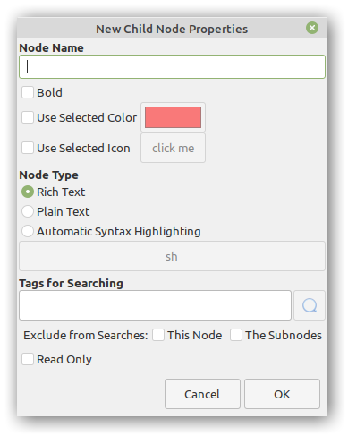 Below this you can insert some tags, for when you do searching for a snippet. So you can add “php database connection”. Also you can choose to exclude the subnode from searches, and you can even select to have the page as Read Only. This could be useful if you want to be sure that the content will not be changed or deleted.